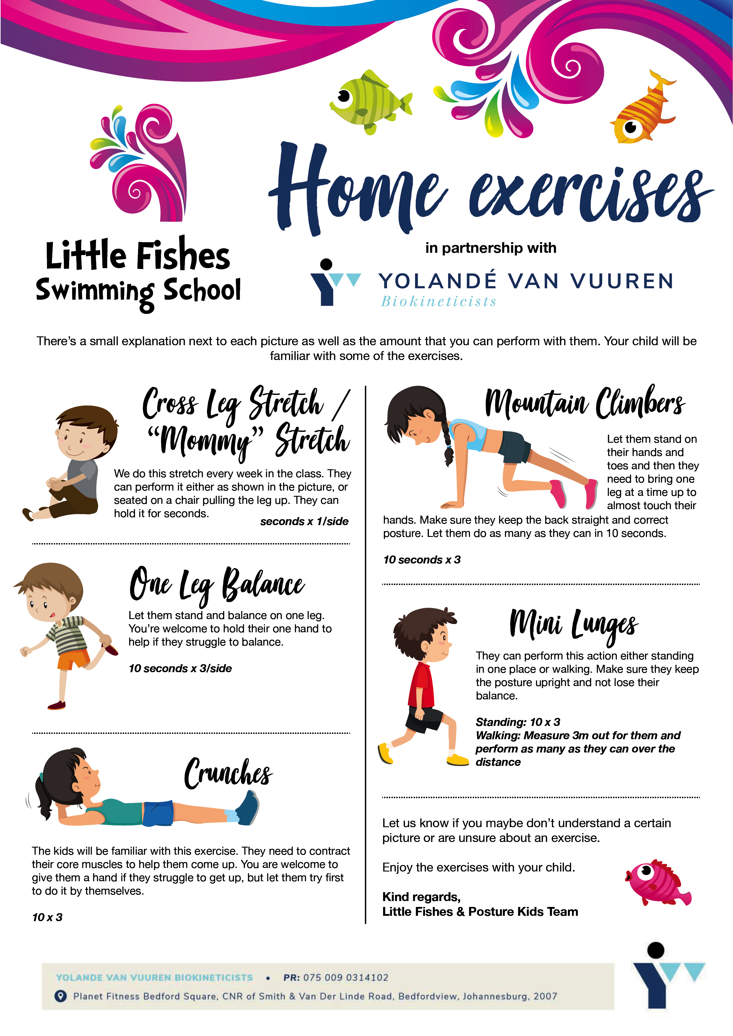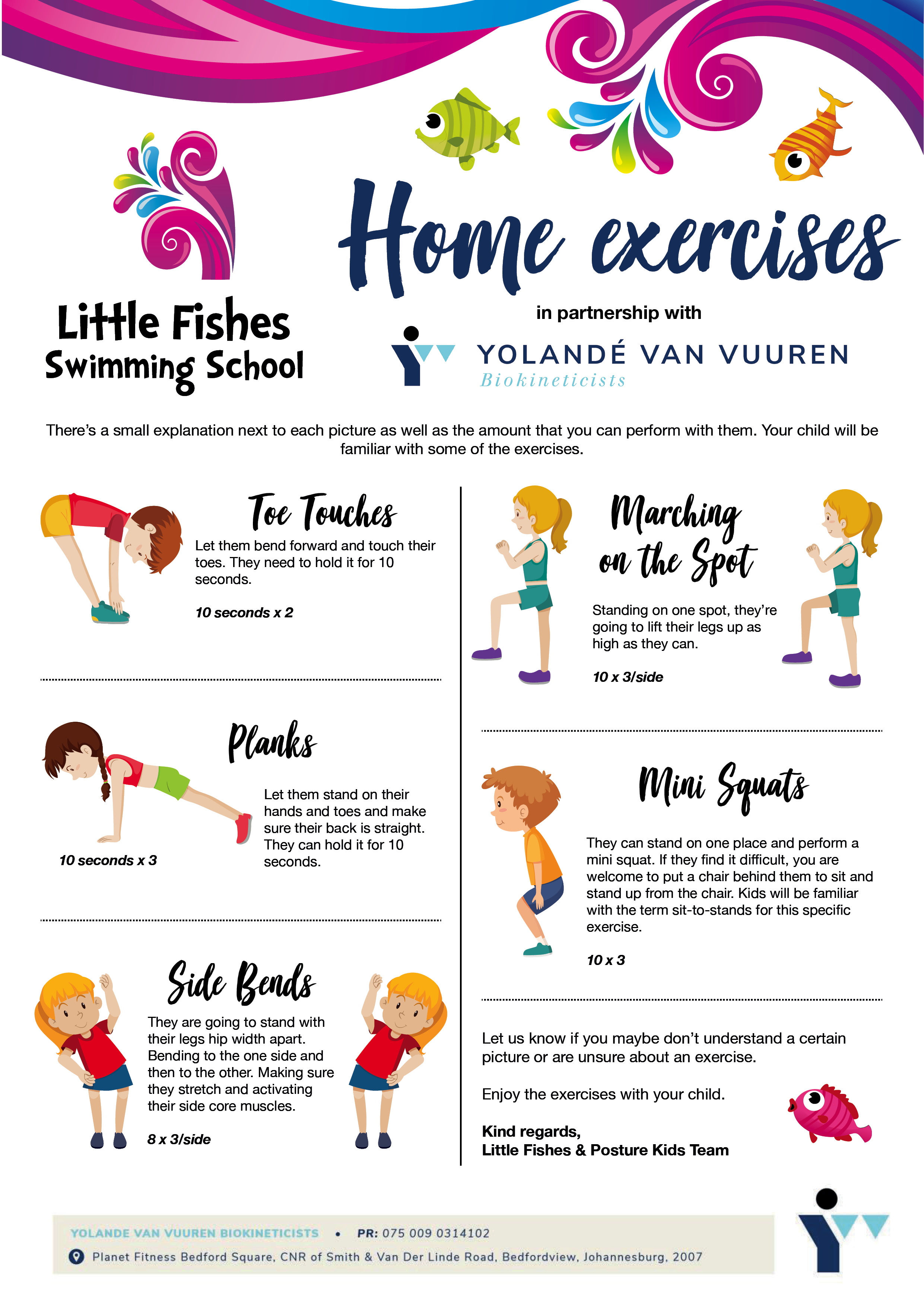 We're missing our little swimmers so much, and we can't wait until we're all back in the pool together. Until then, we've teamed up with Yolande Van Vuuren Biokineticists to provide some at-home exercises to keep you strong and help to ensure that you don't lose all the effort and advancements that you've made so far.
